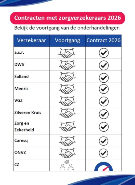 Wij streven ernaar om, net als in 2025, met alle zorgverzekeraars goede afspraken te maken. Zodra de overeenkomsten volledig zijn afgerond, zullen wij dit via onze communicatiekanalen melden.